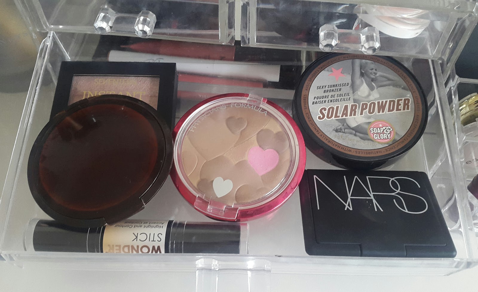 In the first large draw is bronzers we have physicians formula, the body shop honey bronzer, soap and glory solar powder, 19 pink bronze, nyx wonder stick and a random Nars blush in deep throat (review here).