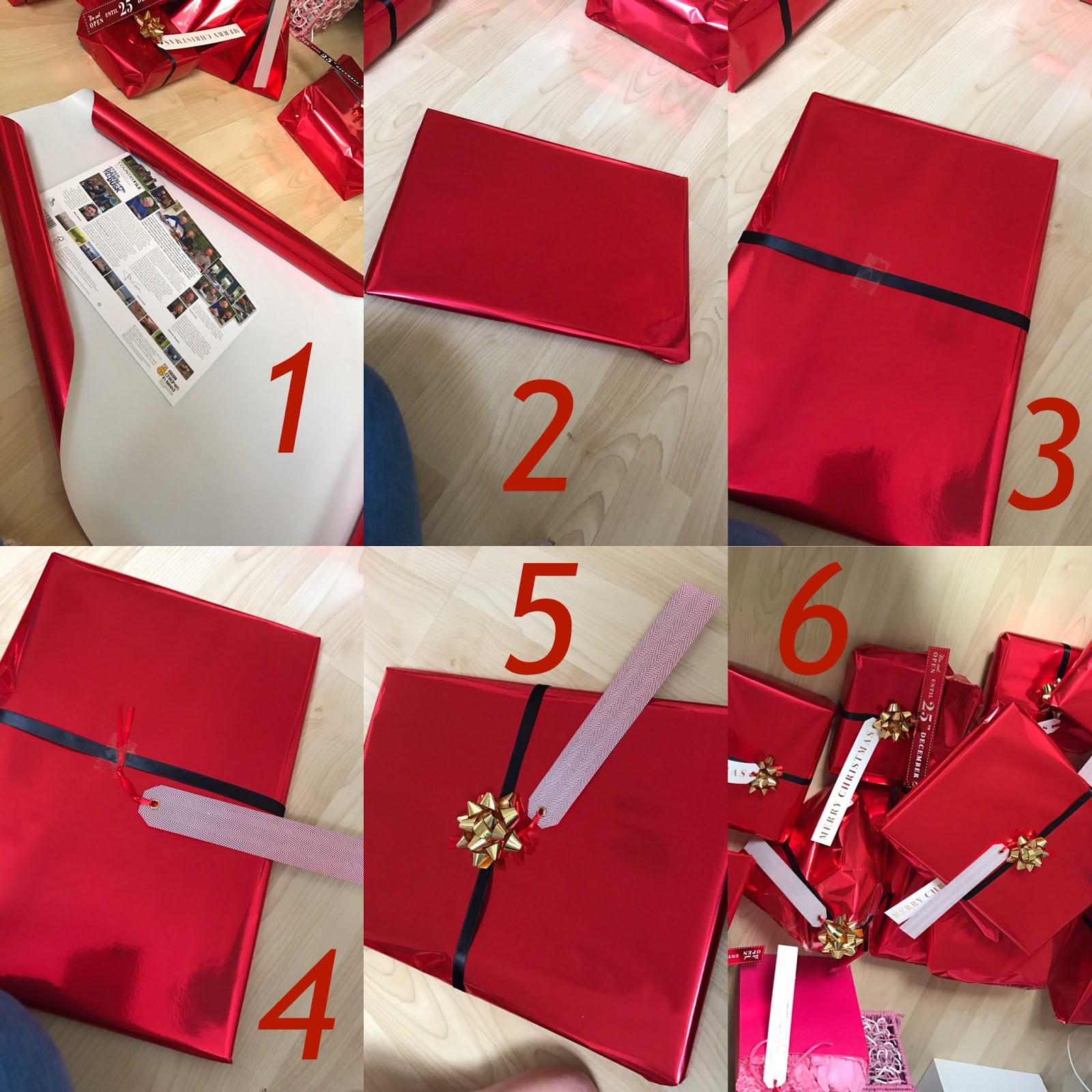 - You'll need plain red wrapping paper, black ribbon, gold bow and gift tags