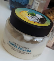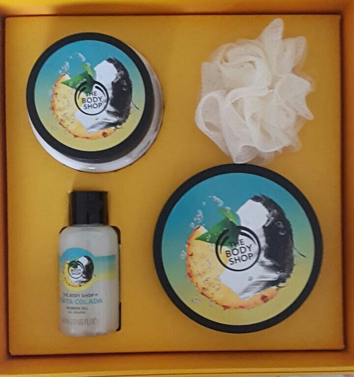 This collection is of course released for summer and is a spin on the Pina Colada cocktail, it reminds me of holidays. So in the set you got a full size body butter, body scrub, travel size shower gel and a body puff all for £25 but £15 in the sale.